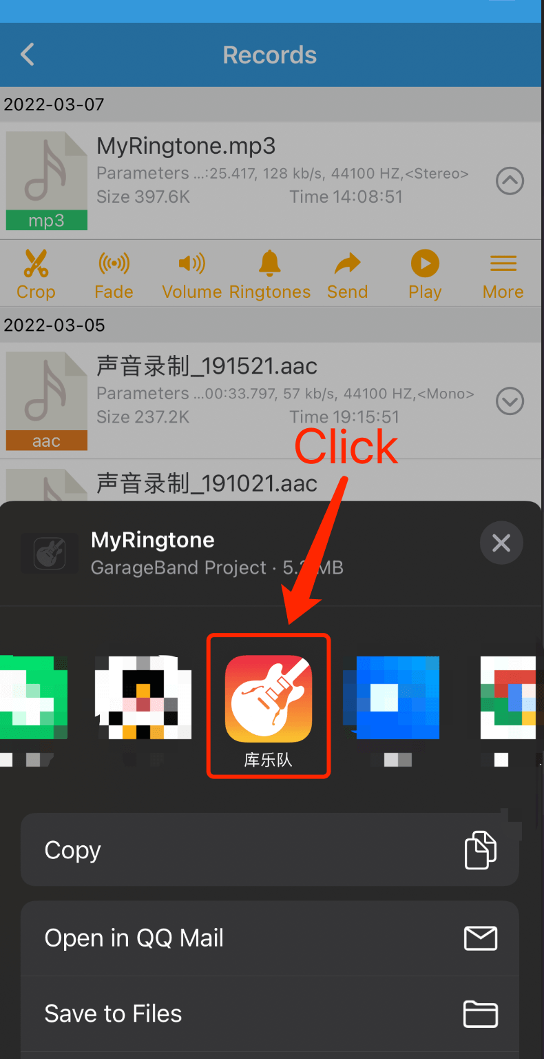 Find the “GarageBand” APP in the pop-up window,If you can’t find it, you will find it in “More” on the right, and click “GarageBand”, and share the ringtone to GarageBand.