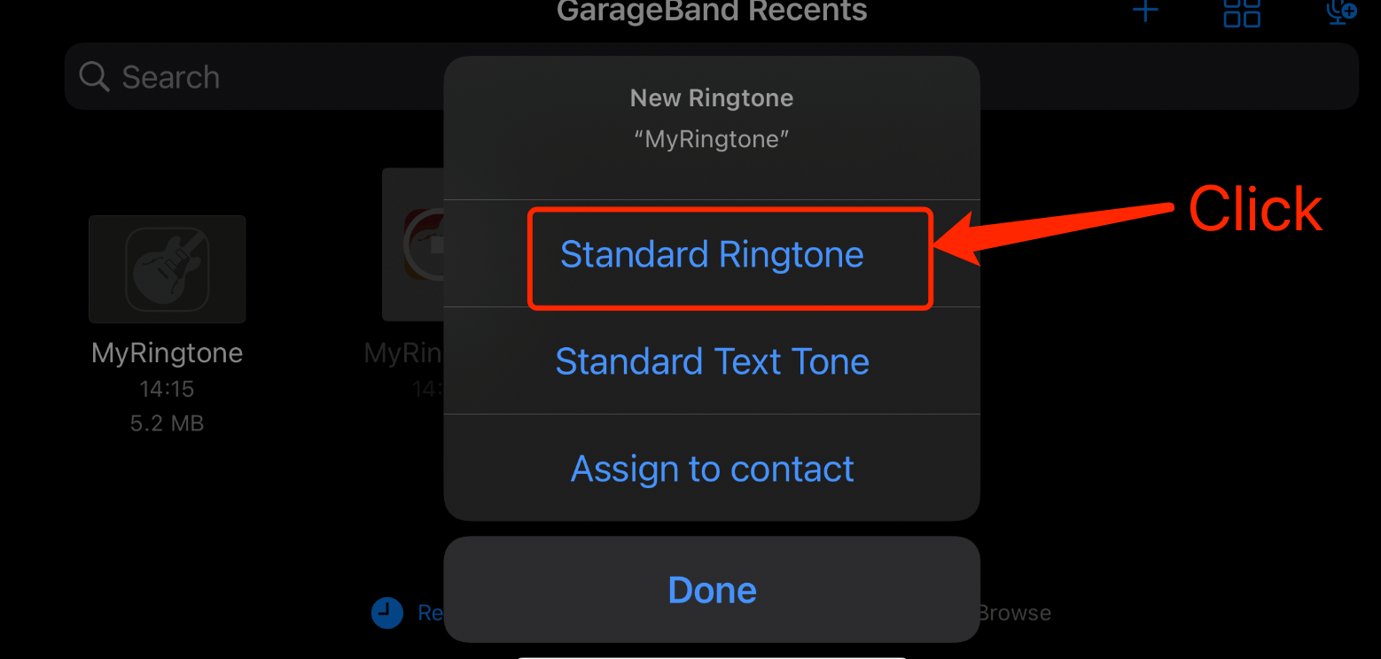 - In the pop-up menu, click “Standard Ringtone” or “Standard Text Ringtone” according to your needs, as shown below