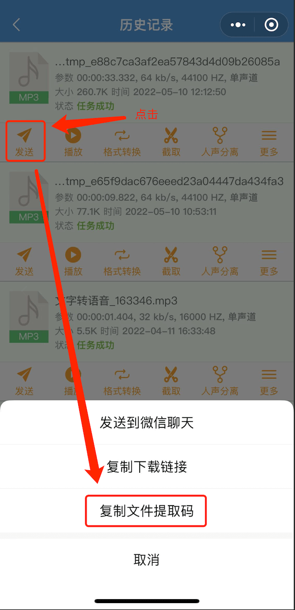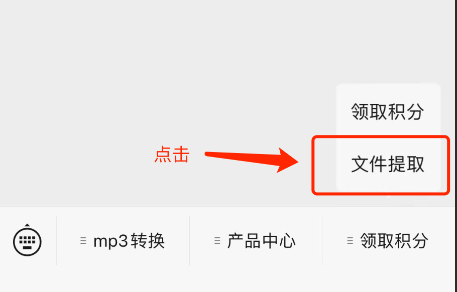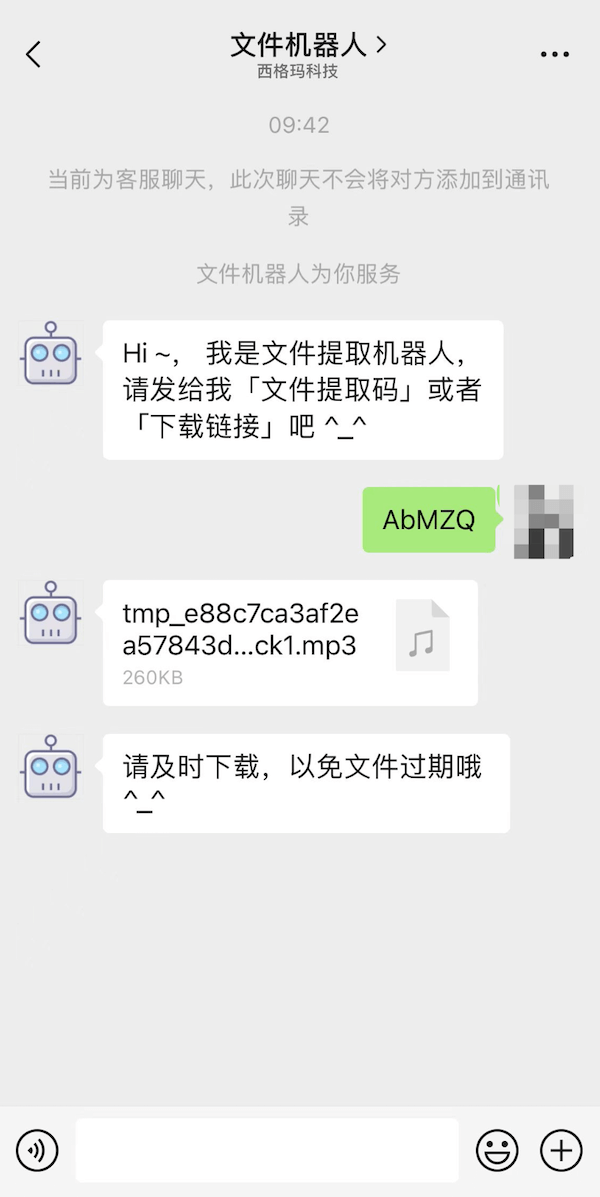 使用文件机器人提取文件 发表于 2022-05-13 分类于 iOS , Android , 微信小程序 这篇教程将教会你如何使用客服文件机器人提取云任务的中的文件 Hi ~~,我的大英雄,让我来教你如何使用客服文件机器人提取云任务的中的文件吧 ^_^ 打开文件机器人1. 微信搜索公众号「mp3提取转换器工具」并关注 2. 点击「文件提取」菜单即可打开文件机器人,如下图 开始提取文件1. 前往「个人中心」-「云任务」中找到要下载的文件记录后,点击「发送」-「复制文件提取码」,如下图所示 2. 将复制好的文件提取码发送给文件机器人,发送后机器人就会将提取的文件发送给你,如下图所示 注意: 目前文件机器人暂时只能提取小于20M的文件,超过20M的文件请参考下方的链接查看下载方法哦 (安卓)音频提取王文件下载教程 (苹果)音频提取王文件下载教程