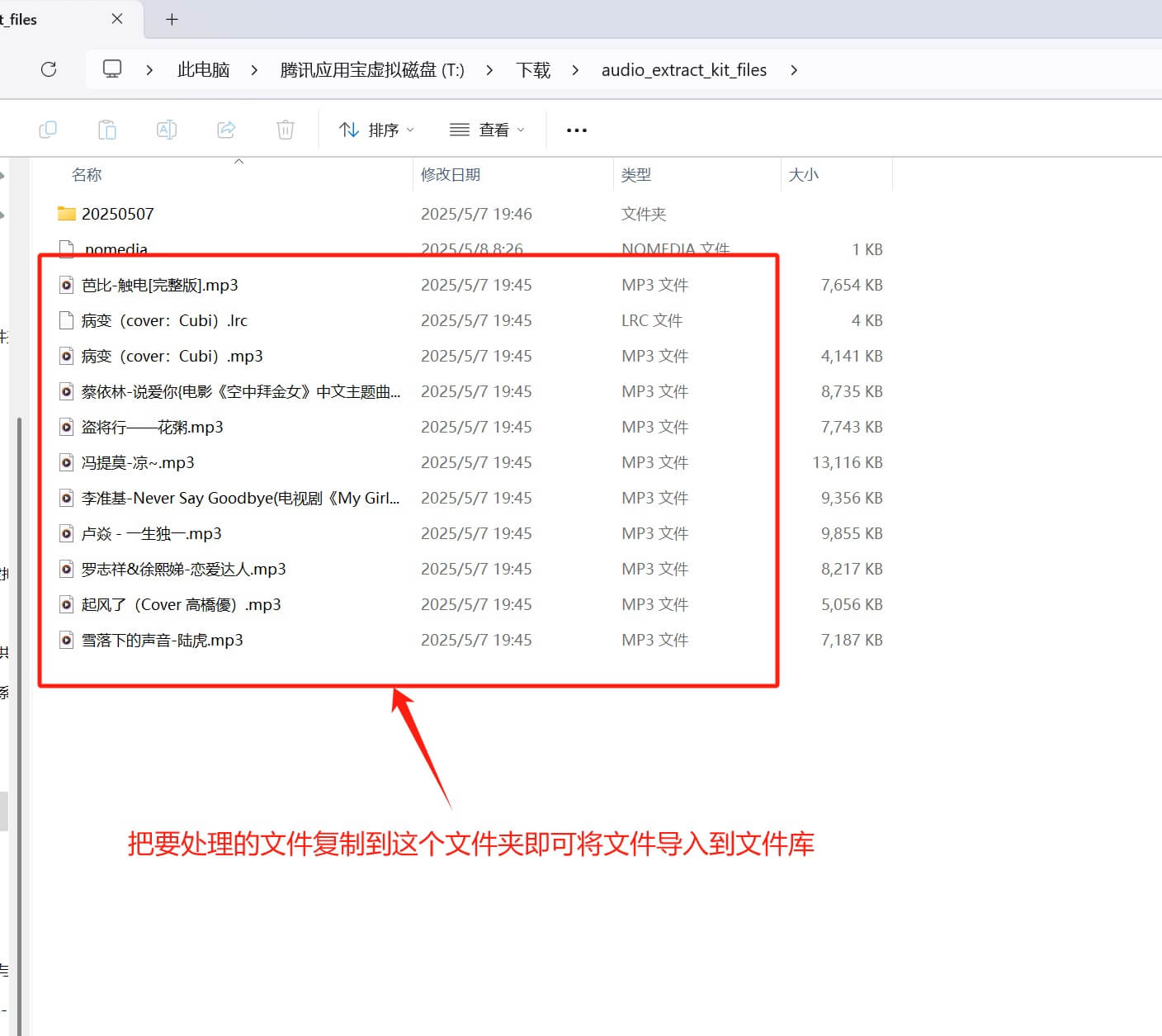 5. 把要处理的文件复制到「audio_extract_kit_files」文件夹即可将文件导入到APP的文件库,如下图所示